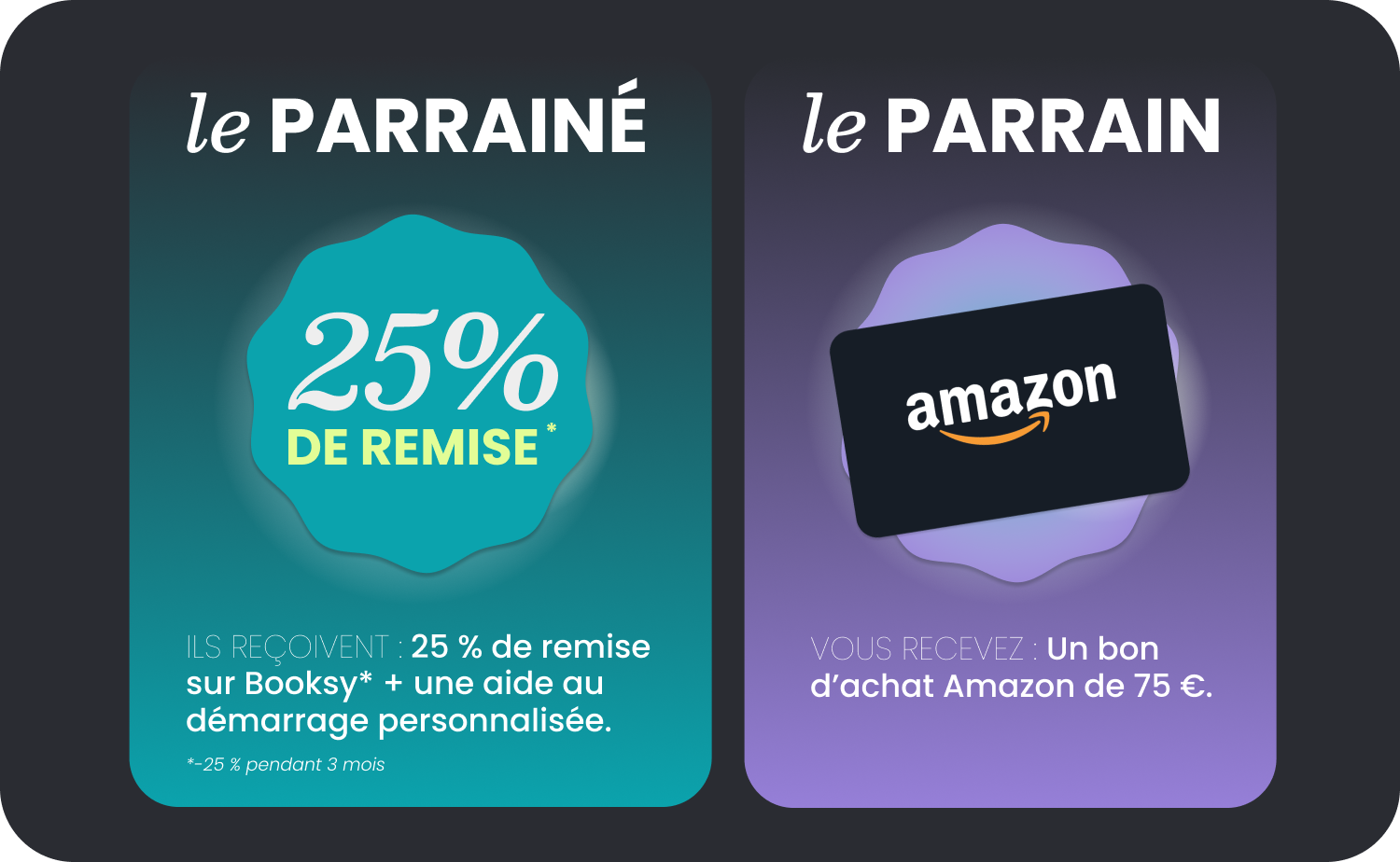 Aidez vos ami(e)s à développer leur activité. Nous leur offrons une remise de 25 %*. Recevez un bon d’achat Amazon de 75 €.