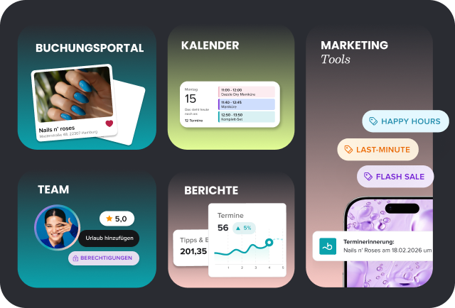 Bleib unkompliziert mit deiner Kundschaft in Kontakt – mit individuellen Nachrichten oder automatisch laufenden Kampagnen, die für dich arbeiten.So stärkst du die Bindung, holst mehr Wiederbuchungen rein und hältst deinen Kalender zuverlässig voll. Alle Tarife enthalten unbegrenzte E-Mails und bis zu 2.000 SMS-Marketingnachrichten pro Monat.