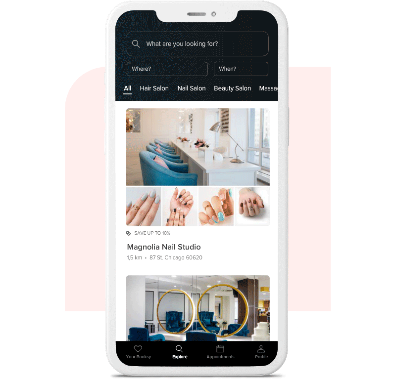 Start exploring with Booksy’s search engine bar! Discover and book appointments to businesses and services in your city by completing the search bar fields with your personalized search info by including criteria such as what you’re looking for, where you’re located, and when you’d like to schedule an appointment for.